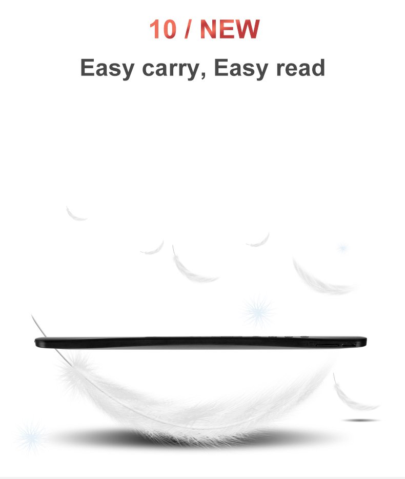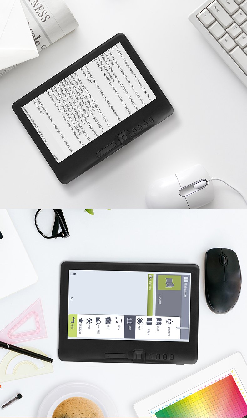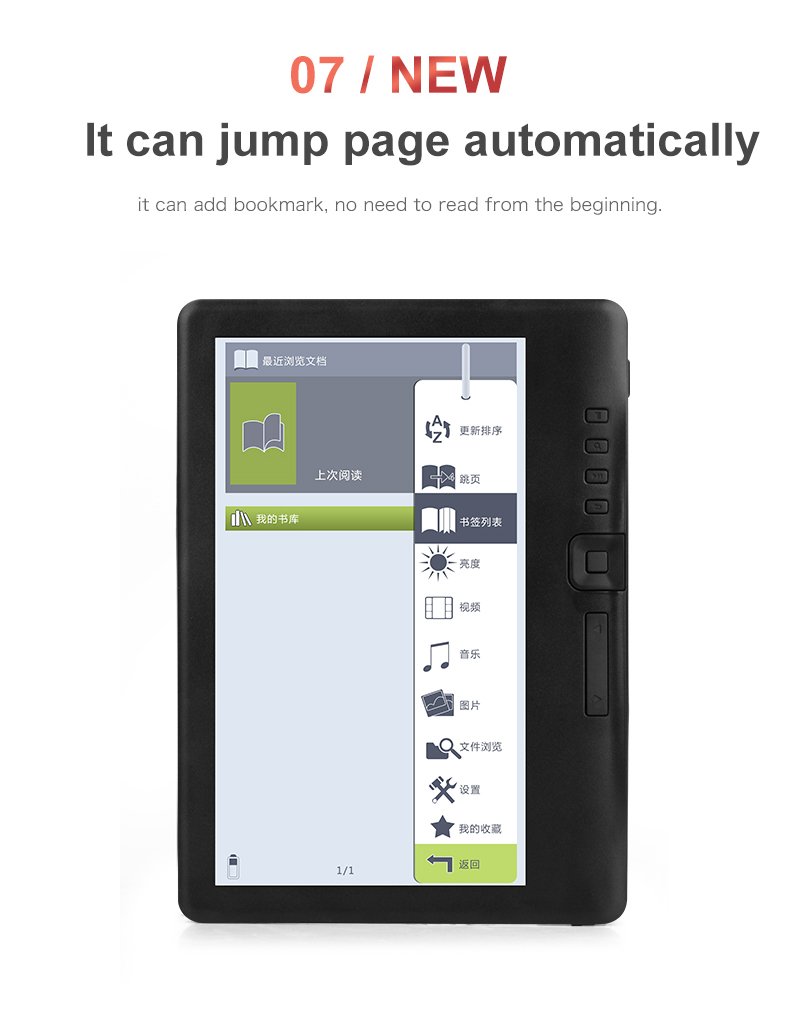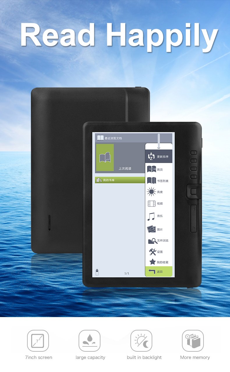 - 7" TFT LCD color screen: 800 x 480 resolution, clear words and easy to read. You can read in the sun without any reflected light. The electronic reader has a built-in backlight that adjusts the brightness to suit the reading environment.