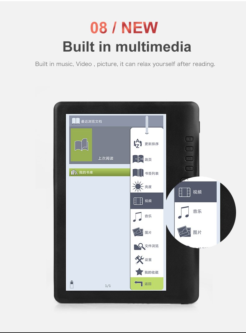 Product Attribute Display Color : Color Memory Capacity : 8GB Resolution Ratio : 800*480 Screen Type : TFT Backlight : Yes WIFI : No Bluetooth : No Comic : Yes Weight : 244g Display Size : 7" Support Type : FB2, PDB, EPUB, PDF, TXT Model Number :... (Read more)