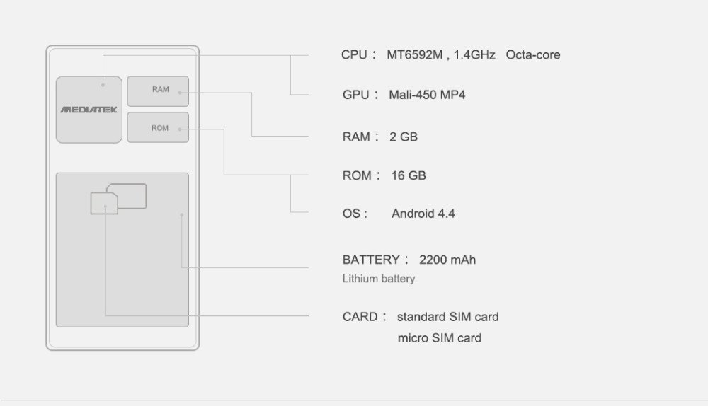 Hardware | OS: Android 4.4 CPU: MTK6592 Octa-Core 1.3GHz RAM: 2GB ROM: 16GB Card Extend: Supports an external TF card up to 32GB (VFAT) |