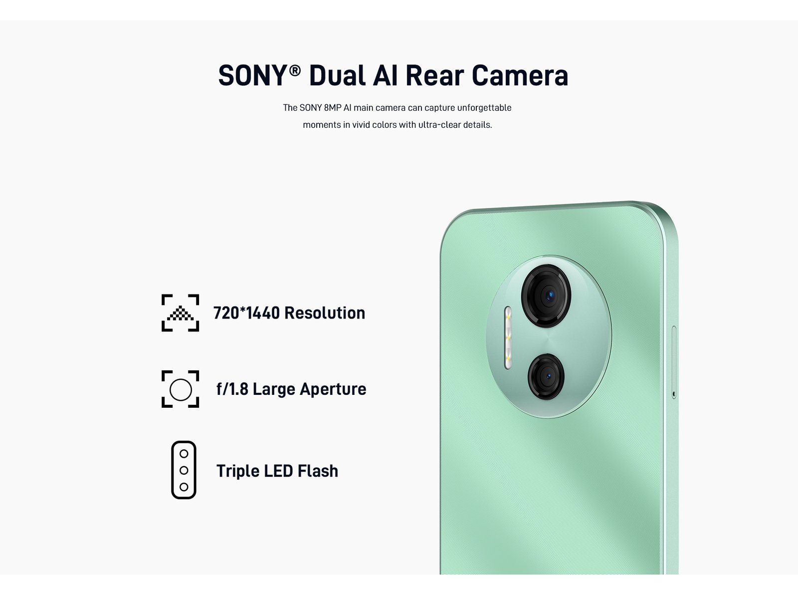 Rear Camera | Dual Camera: 8MP+2MP AI Main Camera: 8MP Samsung S5K4H8YX Sensor chip F/2.0 ± 5% Aperture 80° FOV Supports 3 Rear Flashes Portrait Camera: 2MP F/2.0 ± 5% Aperture 70° FOV |