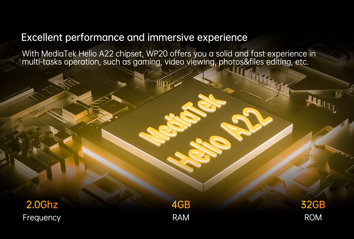 Hardware | OS: Android 12.0 CPU: MT6761, 4*Cortex-A53 2.0GHz, 12nm, Quad-core GPU: IMG GE8300, 660MHz RAM: 4GB ROM: 32GB Card Extend: Support T-Flash Card up to 512GB |