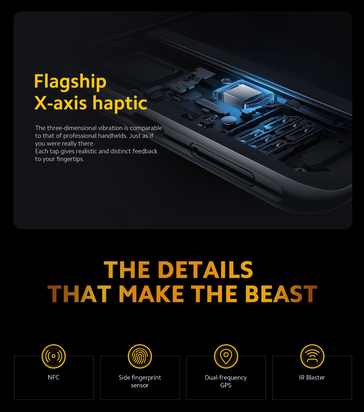 | Other Features | WIFI: Wi-Fi 4, Wi-Fi 5, Wi-Fi 6 and 802.11a/b/g, 2.4GHz Wi-Fi / 5GHz Wi-Fi bluetooth: 5.1 LiquidCool Technology: Yes, 1.0 Plus Navigation and positioning: GPS: L1+L5 | Galileo: E1+E5a | GLONASS: G1 | Beidou: B1I+B2a | Navic Sensor: Proximity sensor | Ambient light sensor | Accelerometer | Gyroscope | Electronic compass | Linear motor | IR Sensor | NFC | Side fingerprint sensor | AI Face Unlock Music player: Dual speakers, Hi-Res Audio certification |