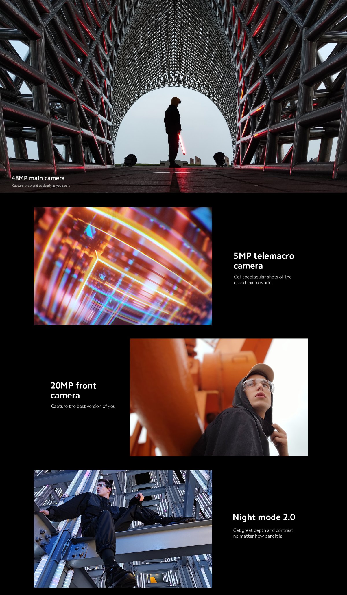 | Rear Camera | Triple Back camera: 48MP + 8MP + 5MP triple rear camera 48MP main camera f/1.79, 1.6μm large pixel (4-in-1) 8MP ultra-wide camera FOV 119°, f/2.2 5MP telemacro camera f/2.4, Auto focus (3cm-7cm) Rear camera photography features Night mode 2.0 Rear camera video features One-Click AI Cinema: Magic Zoom, Slow Shutter, Time Freeze, Night Time-lapse, Parallel World, Freeze Frame Video Rear video recording 4K 3840x2160 | 30fps 1080p 1920x1080 | 60fps, 30fps 720p 1280x720 | 30fps Slow motion video: 120/240/960fps, 720p/1080p |