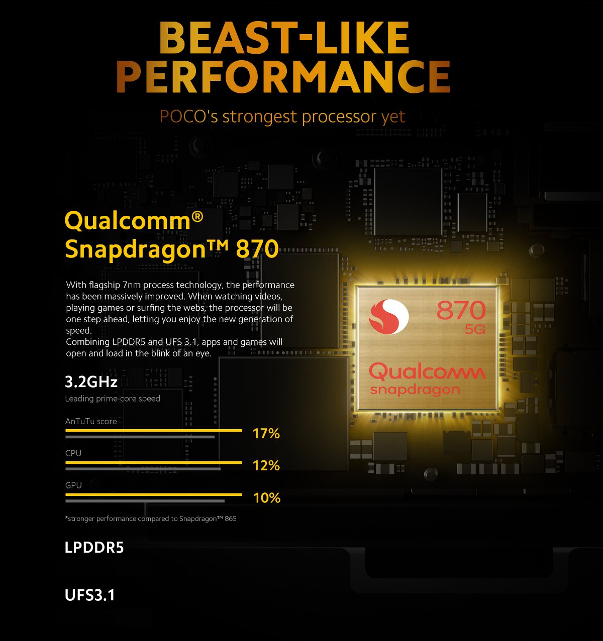 | Hardware | OS: MIUI 12 for POCO (Based on Android 11) CPU: Snapdragon 870 Octa Core, Max to 3.2GHz, 7nm manufacturing process, X55 modem for lightning-fast 5G connectivity GPU: Adreno 650 RAM: 6GB LPDDR5 ROM: 128GB UFS 3.1 Card Extend: Not Support |