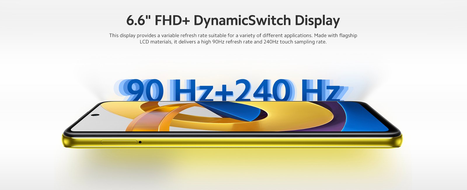 Display | Display Size: 6.6 inch Type: FHD+ Dot Drop display Resolution: 2400x1080 pixels Refresh rate: 90Hz Touch sampling rate: up to 240Hz DynamicSwitch display: 50Hz/60Hz/90Hz Brightness: 450 nits (typ) Features: Sunlight display |