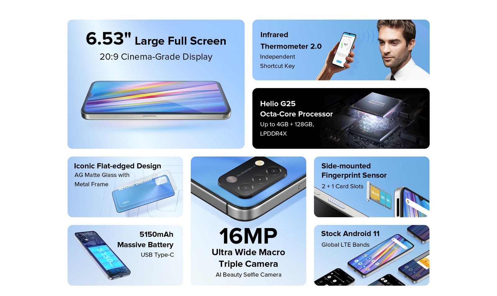 Hardware | OS: Android 11 CPU: MediaTek, Helio G25, 8xCortex-A53, up to 2.0GHz, Octa-core CPU GPU: PowerVR8320, up to 650MHz RAM: 4GB ROM: 128GB RAM Type: LPDDR4X dual channel Storage Type: eMMC 5.1 Card Extend: Yes, Supports expandable storage up to 256GB (VFAT format) |