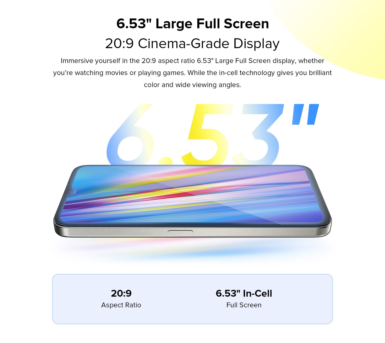 Display | Display Size: 6.53" Full Screen (measured diagonally, ~92.7% Screen-to-body ratio) Type: Dot Drop Display Resolution: 1600*720, HD+ , 20:9 (~269 ppi density) Touch: Capacitive Multi-touch |