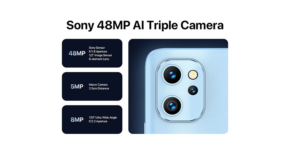 Rear Camera | AI Triple Rear Camera: 48MP+8MP+5MP 48MP main camera, F/1.8 aperture, 6-element lens, 1/2'' image sensor 8MP ultra wide angle camera, FOV 120°, F/2.2 5MP macro camera, 2.5cm macro distance, F/2.4 Features: 48MP HD, Ultra wide-angle mode, Steady handheld night photography, Macro mode, Portrait mode, Panorama mode, HDR, AI Beautify, Ultra wide-angle edge distortion correction, Dual LED flash, Face recognition, Real-time filters Rear camera video features: 1080p, 720p video recording, 30fps |