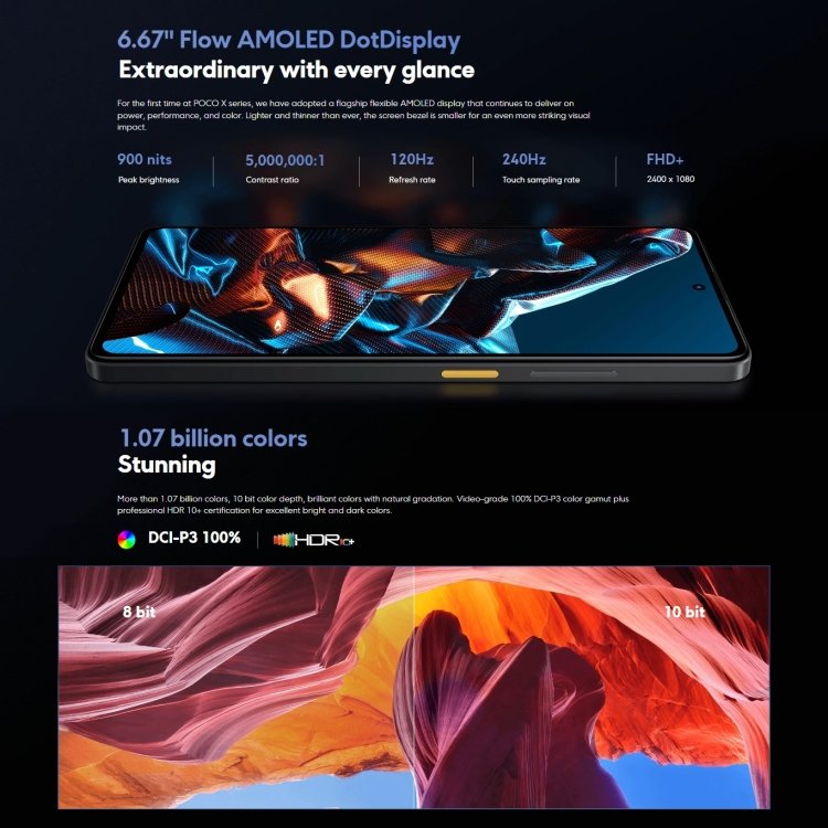 2. 6.67 inch flow AMOLED dot display full screen, DCI-P3 wide color gamut, 2400 x 1080 pixels resolution FHD+ display, 120Hz refresh rate, multi-touch capacitive touchscree. Support sunlight display, reading mode.