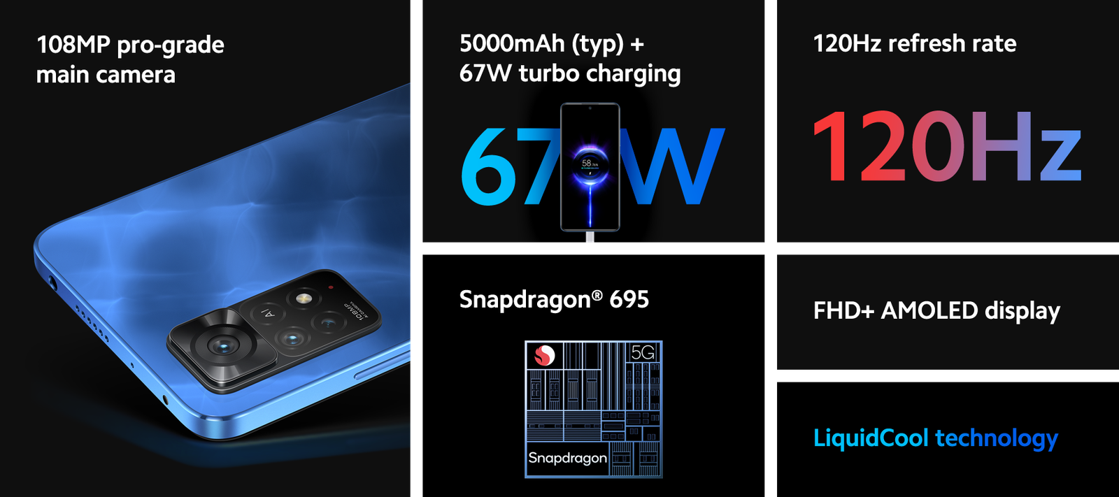 Hardware | OS: MIUI 13, based on Android 11 CPU: Snapdragon 695 Octa Core, up to 2.2GHz GPU: Adreno 619 RAM: 6/8GB LPDDR4X ROM: 64/128GB UFS 2.2 Card Extend: Supports an external TF card up to 1TB |