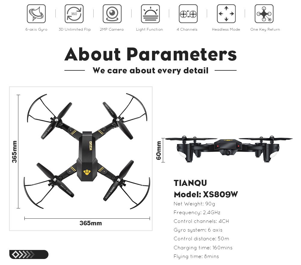 Specifications Certification UL Model Number XS809W RC Drone Controller Mode MODE2 Flight Time About 10mins Control Channels 4 Channels Controller Battery 3 x 1.5V AA battery(not included) Motor Brush Motor Plugs Type USB Warning None Warranty 60... (Read more)