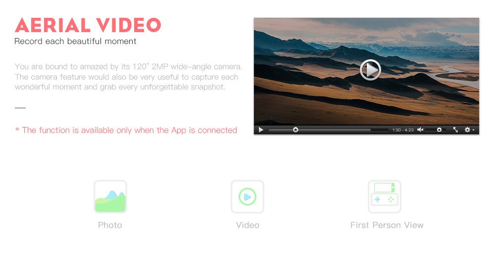 ● WiFi FPV, 0.3MP camera. You can use your phone to pilot the drone and control the pitch of the camera