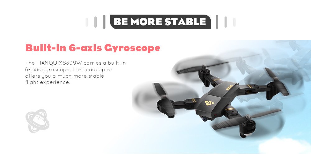 TIANQU XS809W is an awe-inspiring quadcopter with stylish foldable design. The arms can be folded manually, making it easy to be put into any bag. The RTF version supports control via transmitter and mobile device. The G-sensor Mode enables the multicopter to move according to the movement of your smartphone for more intuitive operation.