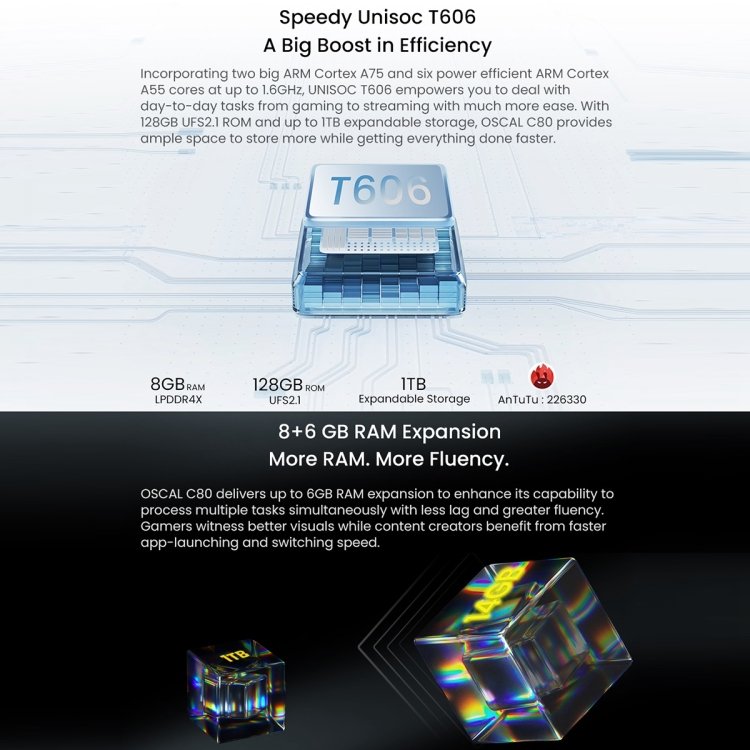 1. Noyau octa Unisoc T606, 2 processeurs A75 1, 6 GHz + 6 processeurs A55 1, 6 GHz, performances puissantes.