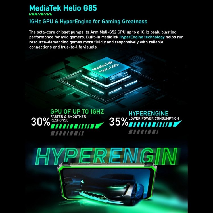 1. MediaTek Helio G85 MT6769Z 2 x A75 2, 0 GHz + 6 x A55 1, 8 GHz CPU, hautes performances, combinés avec 6 Go de RAM + 128 Go de mémoire ROM, fonctionnent rapidement et fonctionnent en douceur.