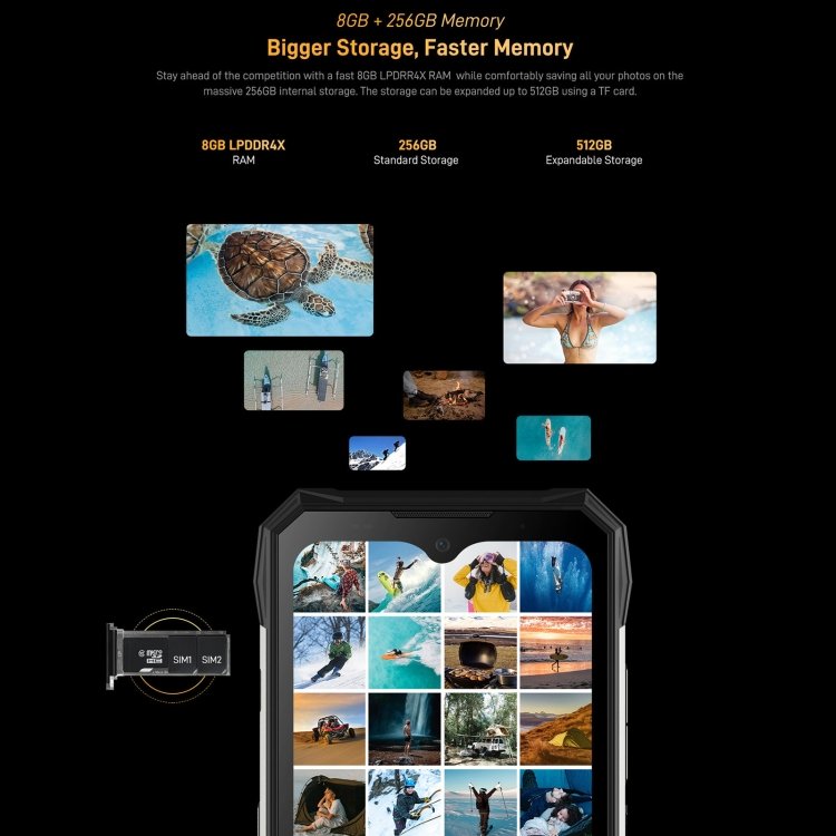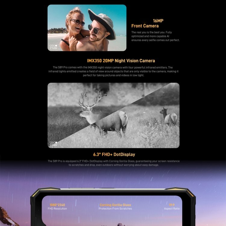 3. Caméra de vision nocturne 64MPIMX586 + 20MP IMX350 avec 4 lumières infrarouges + caméra grand angle et macro 8.0MP S5K4H7, capturez un moment merveilleux, prenez des photos très claires;16.0MP S5K3P9SP Caméra frontale grand angle à 80 degrés, idéale pour le chat vidéo et les selfies.