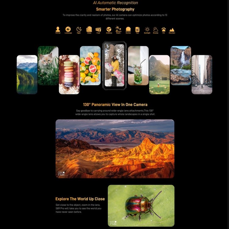 4. Prise en charge de la caméra principale : HDR, AI, Water Mark, Night Vision, Video, Picture, UHD, Night Mode, Pro Mode, Potrait, Gif, Panorama, Slow Motion, Time Lapse, Intelligent Scanning.Prise en charge de la caméra frontale : Vidéo, Image, Gif, Potrait