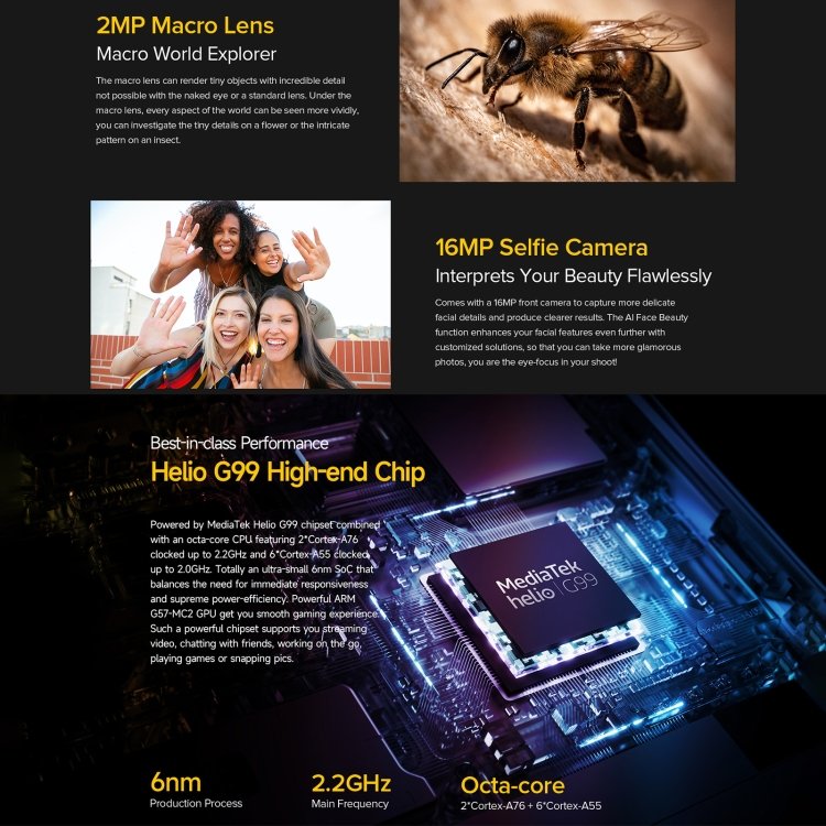 1. Processeur MediaTek Helio G99 octa core 2xCortex A76 2, 2 GHz + 6xCortex A55 2, 0 GHz, bonnes performances, fonctionnement rapide et fluide.