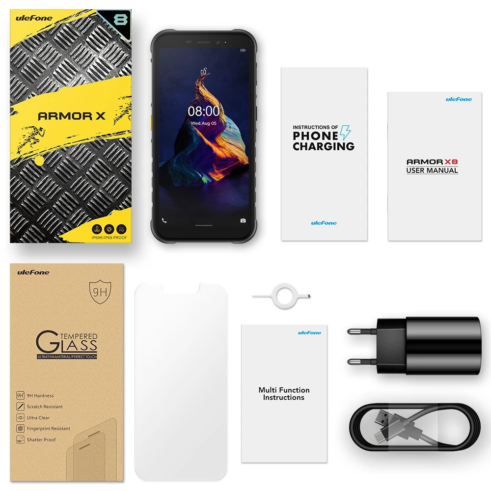 | Liste de colisage | 1 x Ulefone Armor X8 Téléphone intelligent 1 x câble de données (100 cm) 1 x protecteur d'écran en verre trempé 1 x aiguille SIM 1 x chargeur EU |